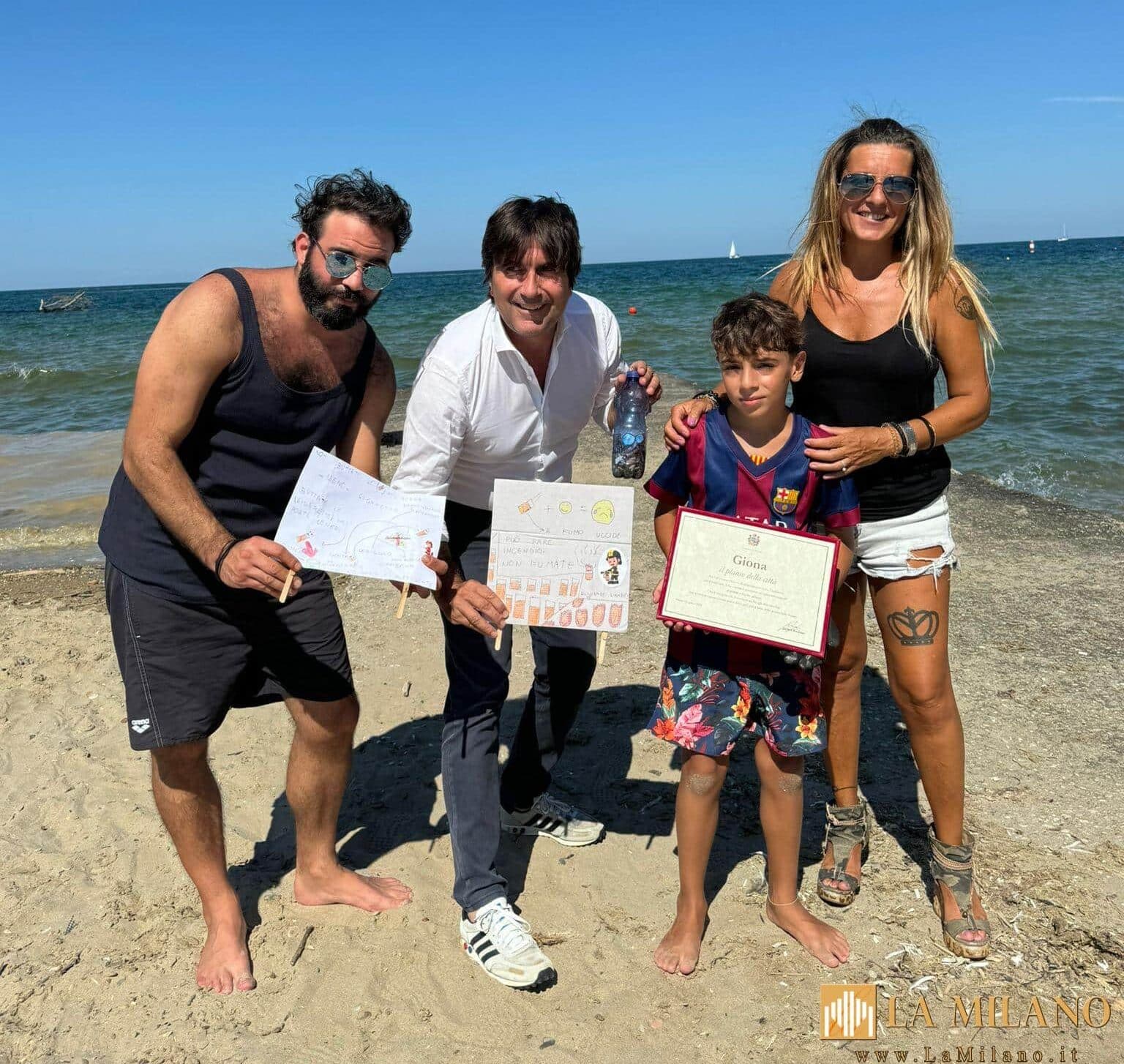 Pesaro: il sindaco Andrea Biancani consegna il Plauso della città a Giona, un bambino di 8 anni che accoglie le cicche di sigarette dalla spiaggia.